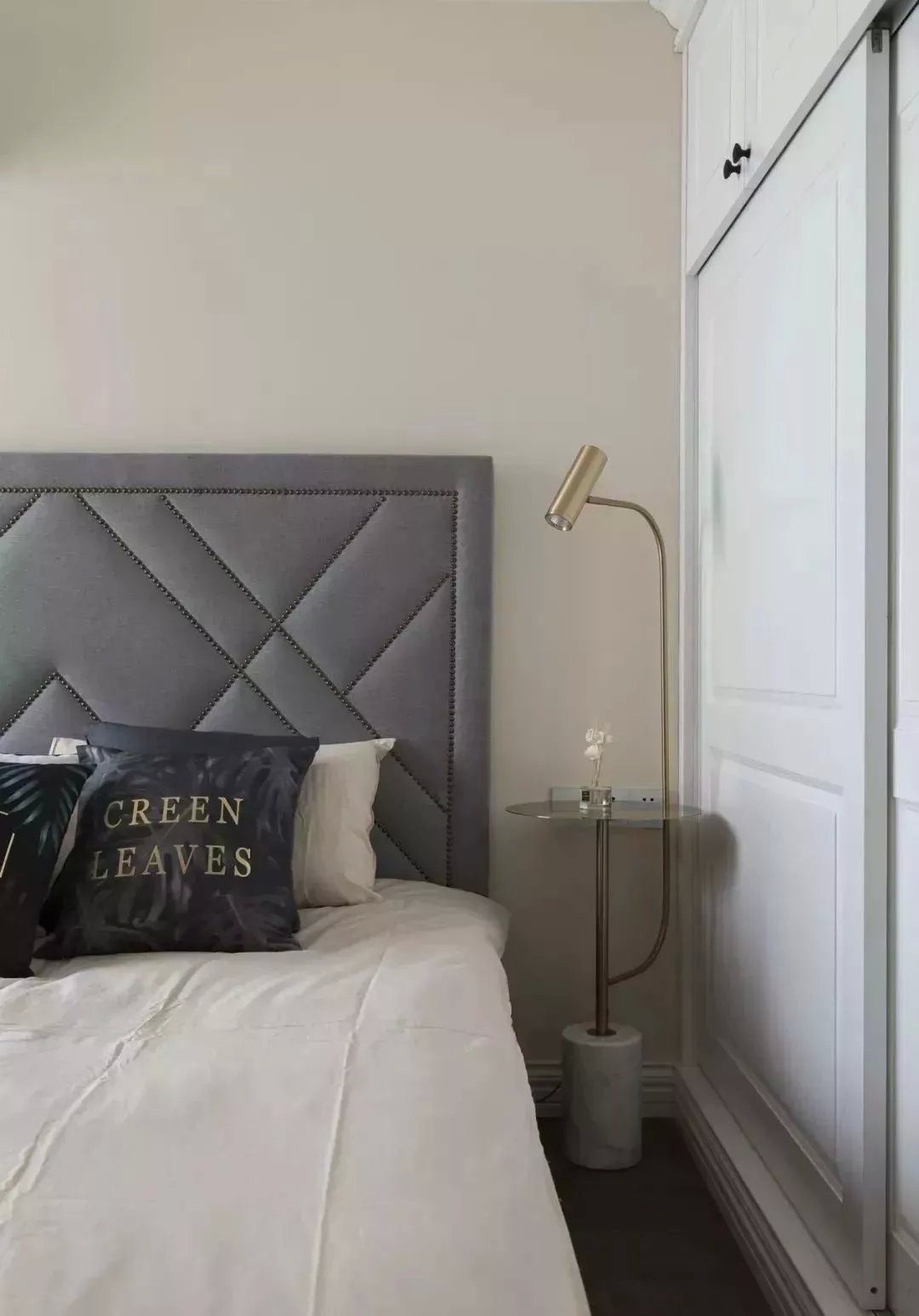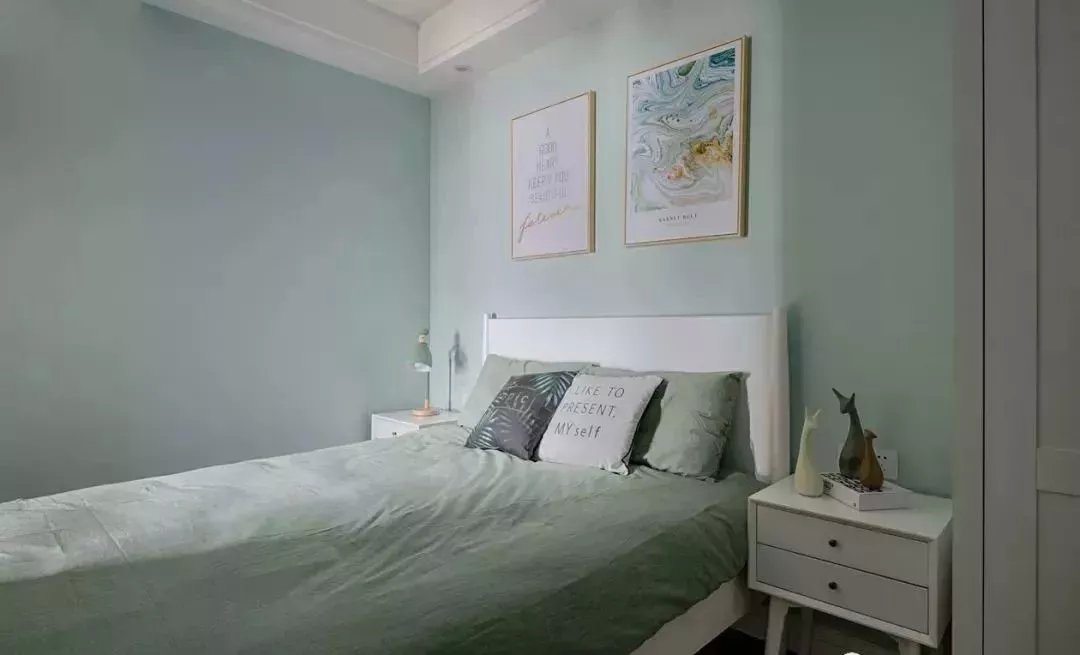 黑白灰是最北歐風(fēng)里最常見的主色調(diào),但是為了讓臥室的色調(diào)不會(huì)太過沉悶與單調(diào),所以偶爾會(huì)用一些比較清新的顏色,作為臥室的主色調(diào)或者裝飾。這套二居室的次臥就是如此,稍微帶點(diǎn)灰調(diào)的綠色,清新自然,有一種怡然自得的舒適感,每一幅裝飾畫都是精心挑選出來的,符合整體的家居風(fēng)格。