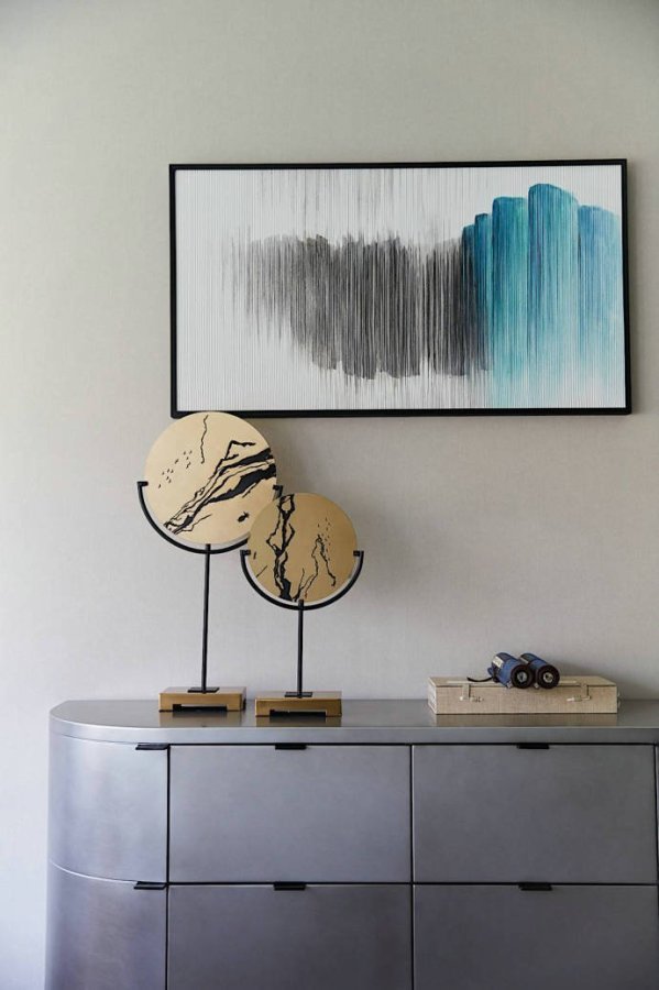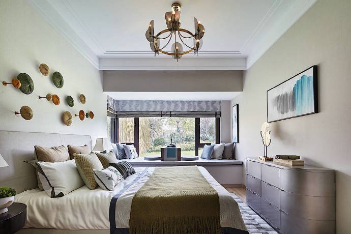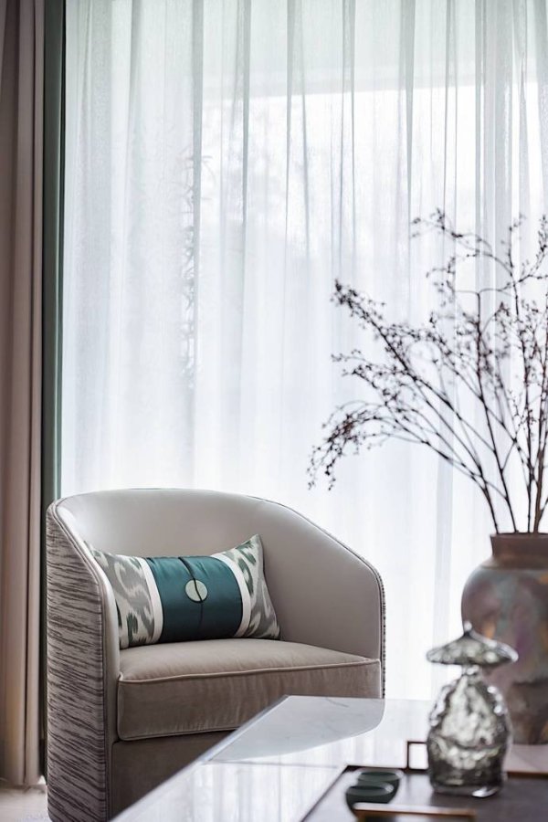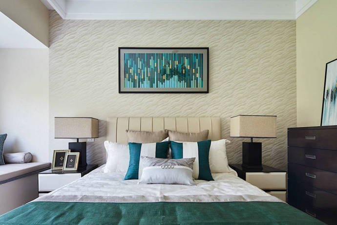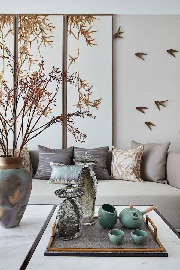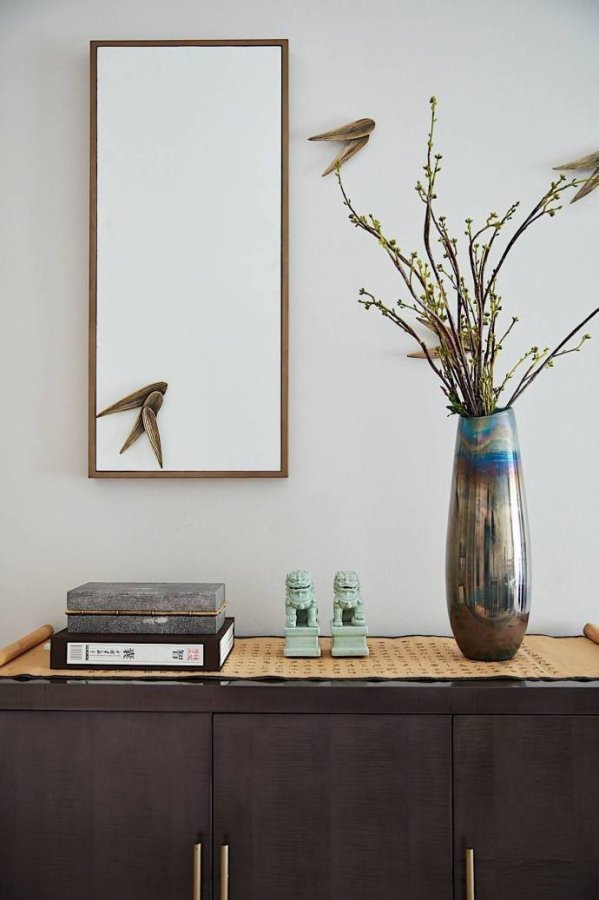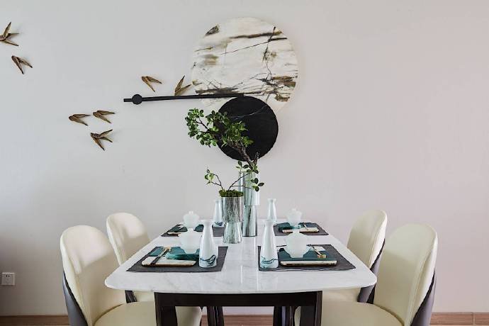 竹子、飛鳥、臘梅,這些元素一結(jié)合在一起,你就能很明顯地看出業(yè)主的喜好。業(yè)主喜歡中國傳統(tǒng)文化,也喜歡中式風(fēng)格的裝修,但是也要考慮家里妻子和孩子的喜好,所以就有了這樣一套簡單時(shí)尚、禪意十足的新中式裝修。如果只用黑白水墨打造中國風(fēng),未免太單調(diào),所以設(shè)計(jì)師加入了一點(diǎn)孔雀藍(lán)的色彩,質(zhì)感十足。