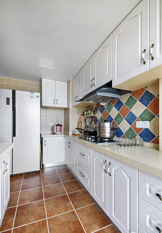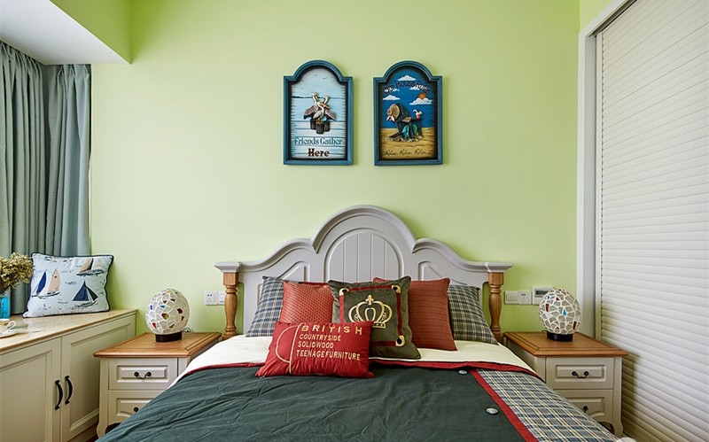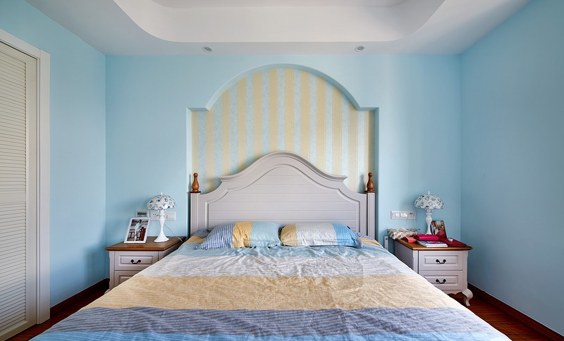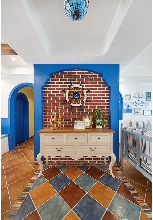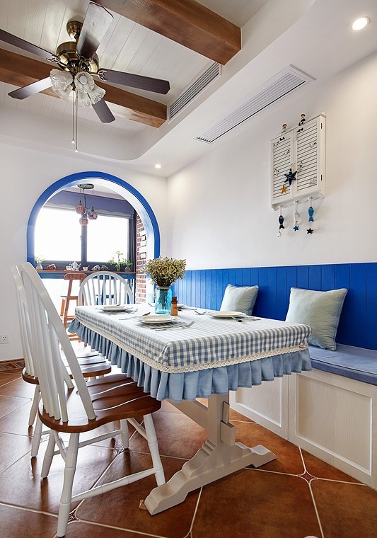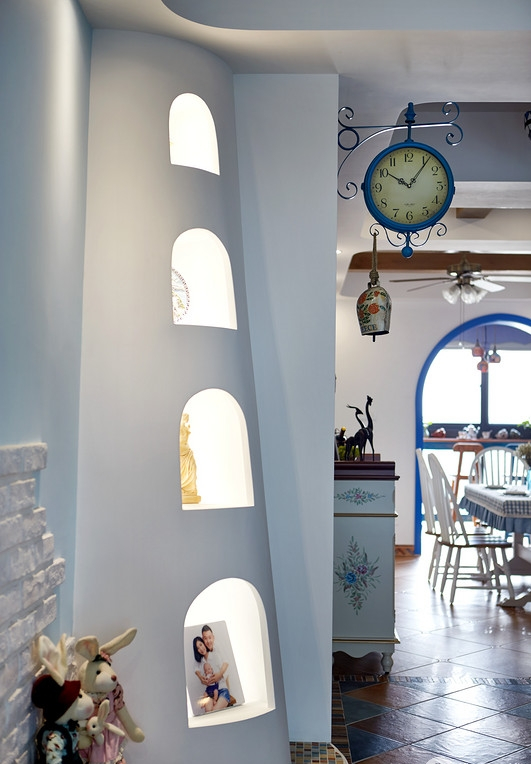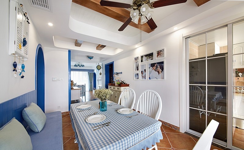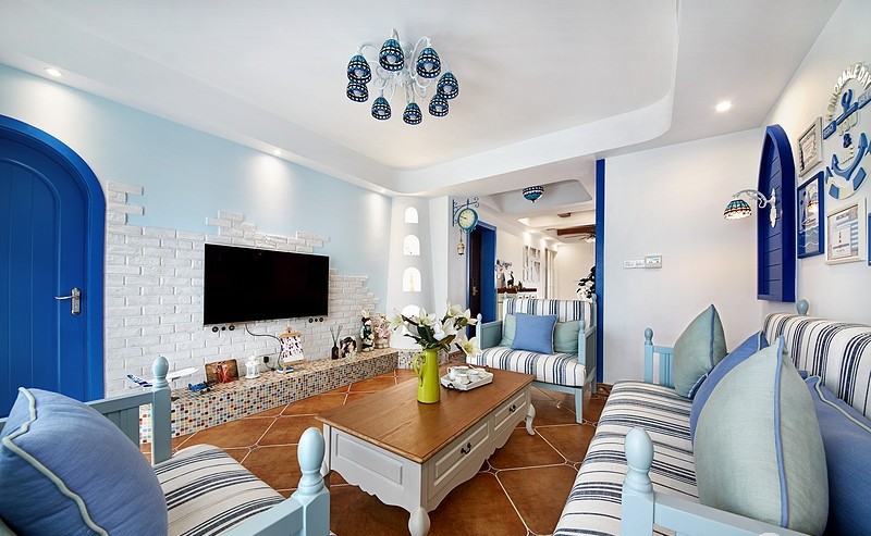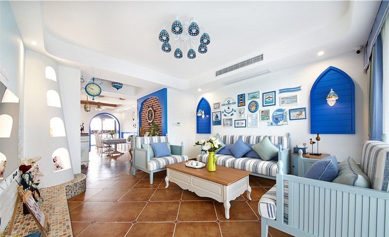 業(yè)主很喜歡地中海風格帶來的那種“海洋”的感覺,但是又不希望藍色占據(jù)太多家里面積,所以設計師為他打造了這樣一套以白色為主,藍色做點綴的地中海風格??蛷d和廚房是很清新的藍與白,給人一種海風拂面的感覺。其中一件臥室用的是淺綠色作為主色調,但也不會顯得突兀,同樣適宜地中海風格。