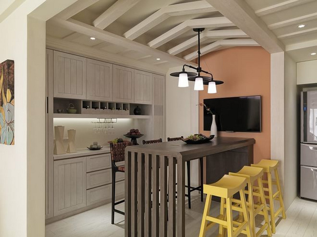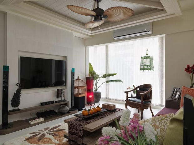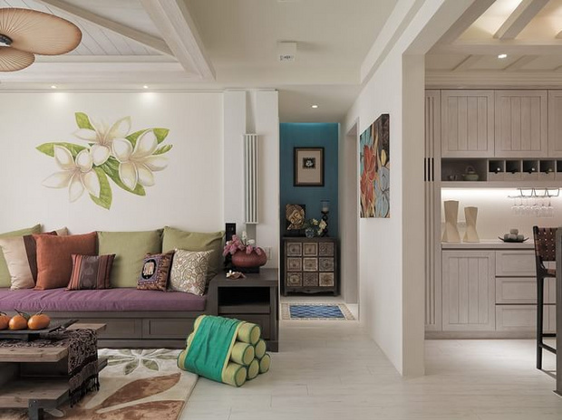 這套東南亞風格的二居室,沒有像之前常見的東南亞風格一樣,大面積使用棕色做裝飾,反而是以白色為主,適當點綴一些民族特色十足的裝飾,因此整體的氛圍比較清新,不會顯得雜亂。設計師往客廳增添了不少綠植,跟背景墻上的花樣相呼應,賞心悅目,沁人心脾。