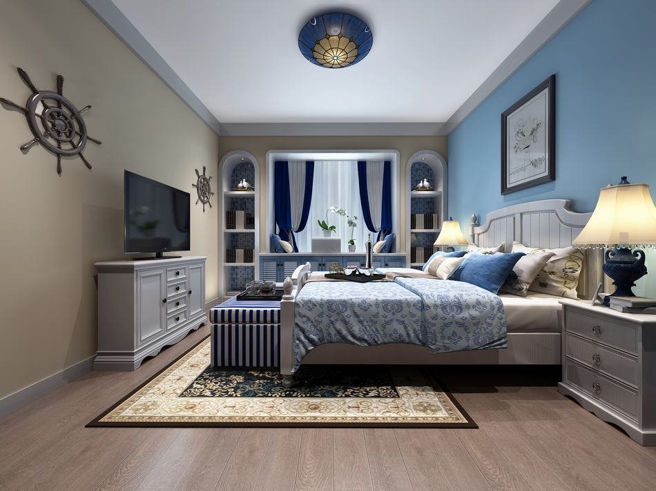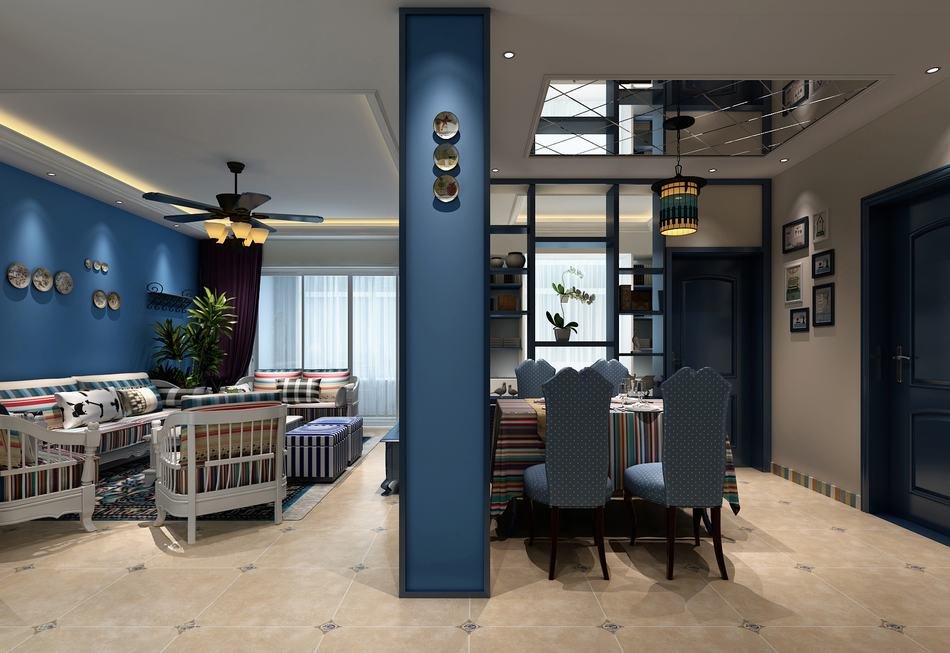 這套地中海風格用深藍色作為客廳背景墻的主色調,配上鐵藝的置物架和吊頂,質感十足。客廳和餐廳用電視背景墻做隔斷,兩個空間互不影響。臥室的墻上安置了兩個船舵做壁飾,有一種航海的感覺。對于喜歡異國風情的業(yè)主來說,地中海風格是個不錯的選擇。