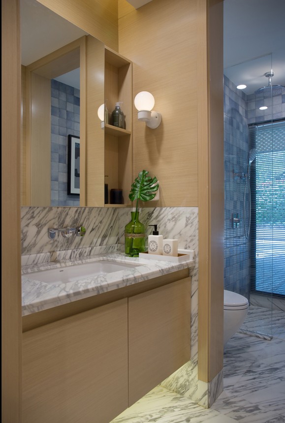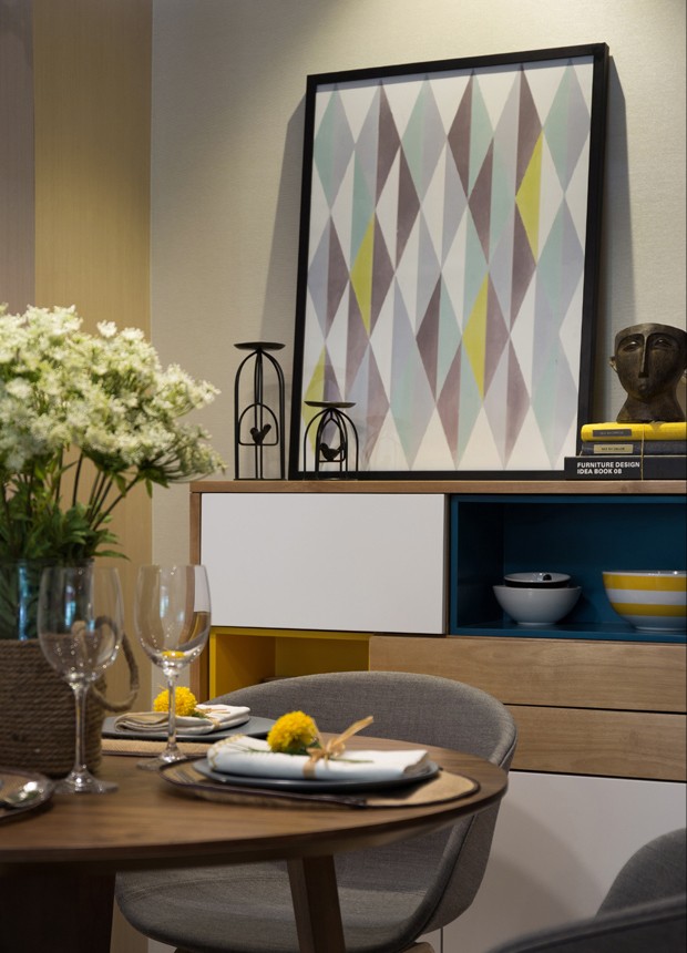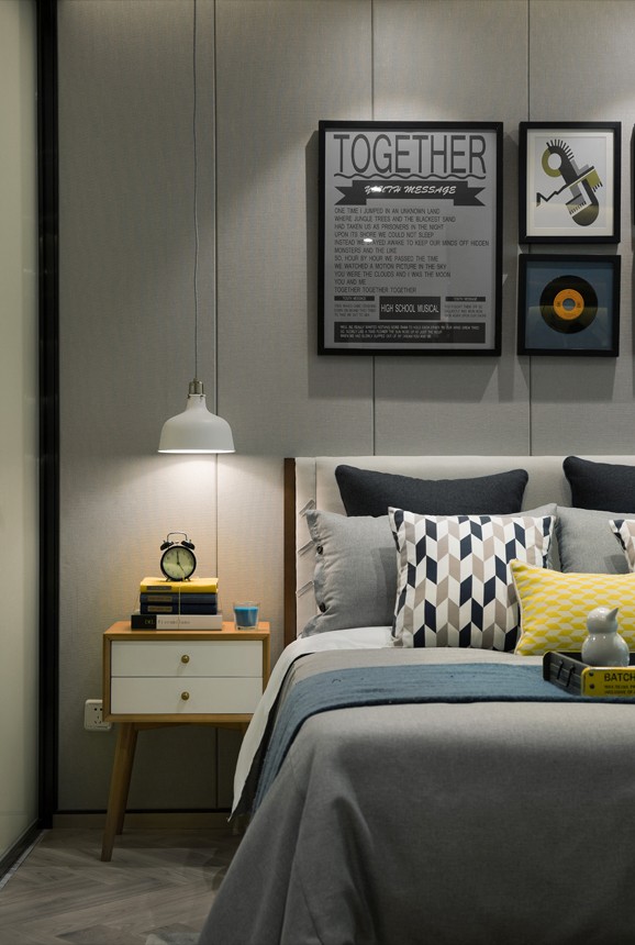 這套現(xiàn)代風(fēng)格的裝飾很是時尚,不管是壁畫還是擺飾,都是設(shè)計師精心挑選過的??蛷d的墻面和沙發(fā)都是灰色調(diào),但是為了使整個空間看起來不會太單調(diào),設(shè)計師用了壁畫和亮色抱枕,去打造一種層次感。衛(wèi)生間干濕分離,盥洗臺很大,兩個人同時使用也沒問題。