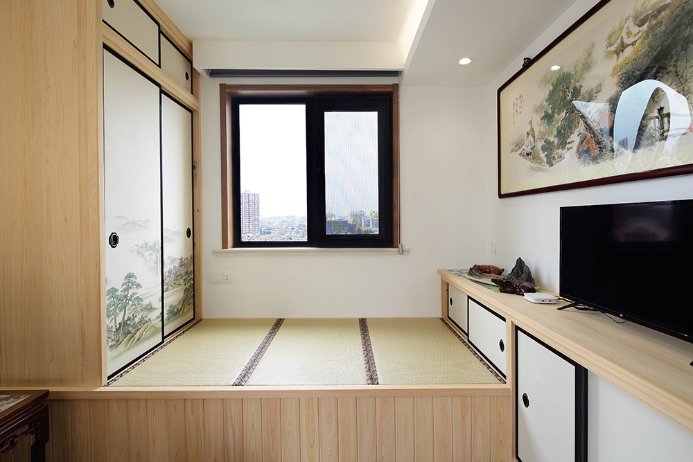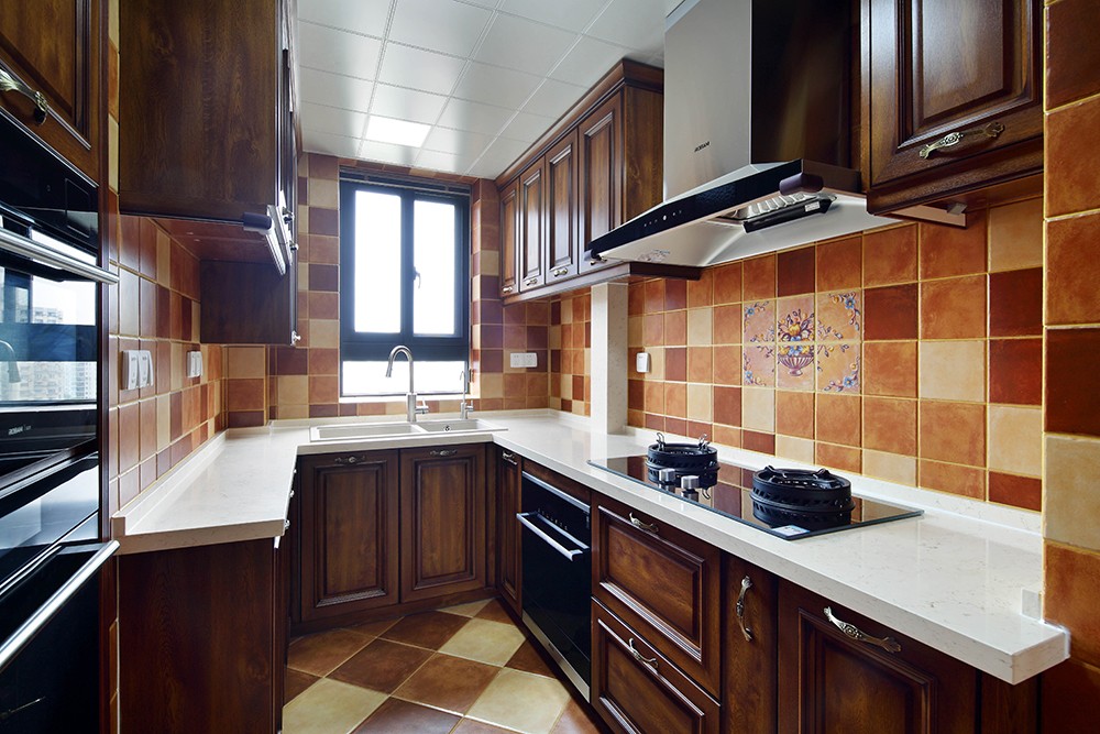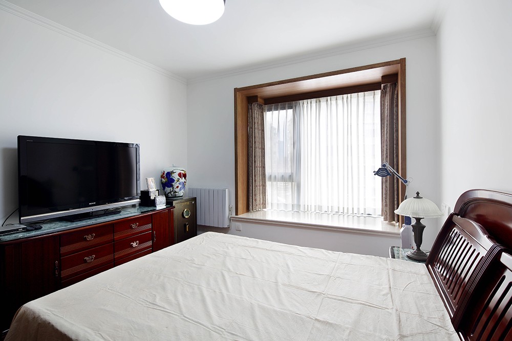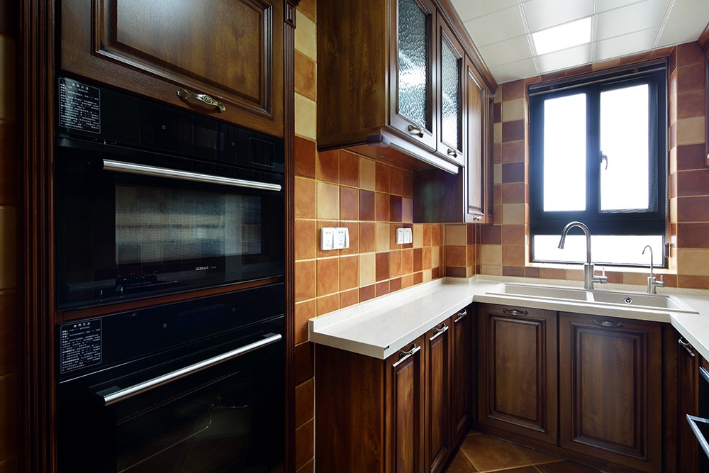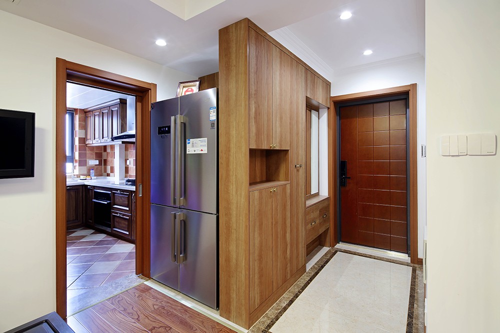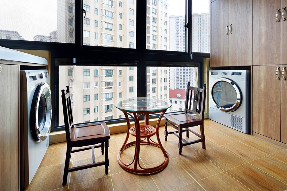 業(yè)主從老家?guī)С隽艘徽装嘿F的紅木家具,所以中式風格自然而然地成為了整個家的主基調(diào)??蛷d和餐廳并沒有做過多的裝飾,就只是一套紅木家具,就足以體現(xiàn)出中式風的沉穩(wěn)與厚重。廚房和陽臺都使用了櫥柜內(nèi)嵌家電的設計,能夠釋放出不少空間。