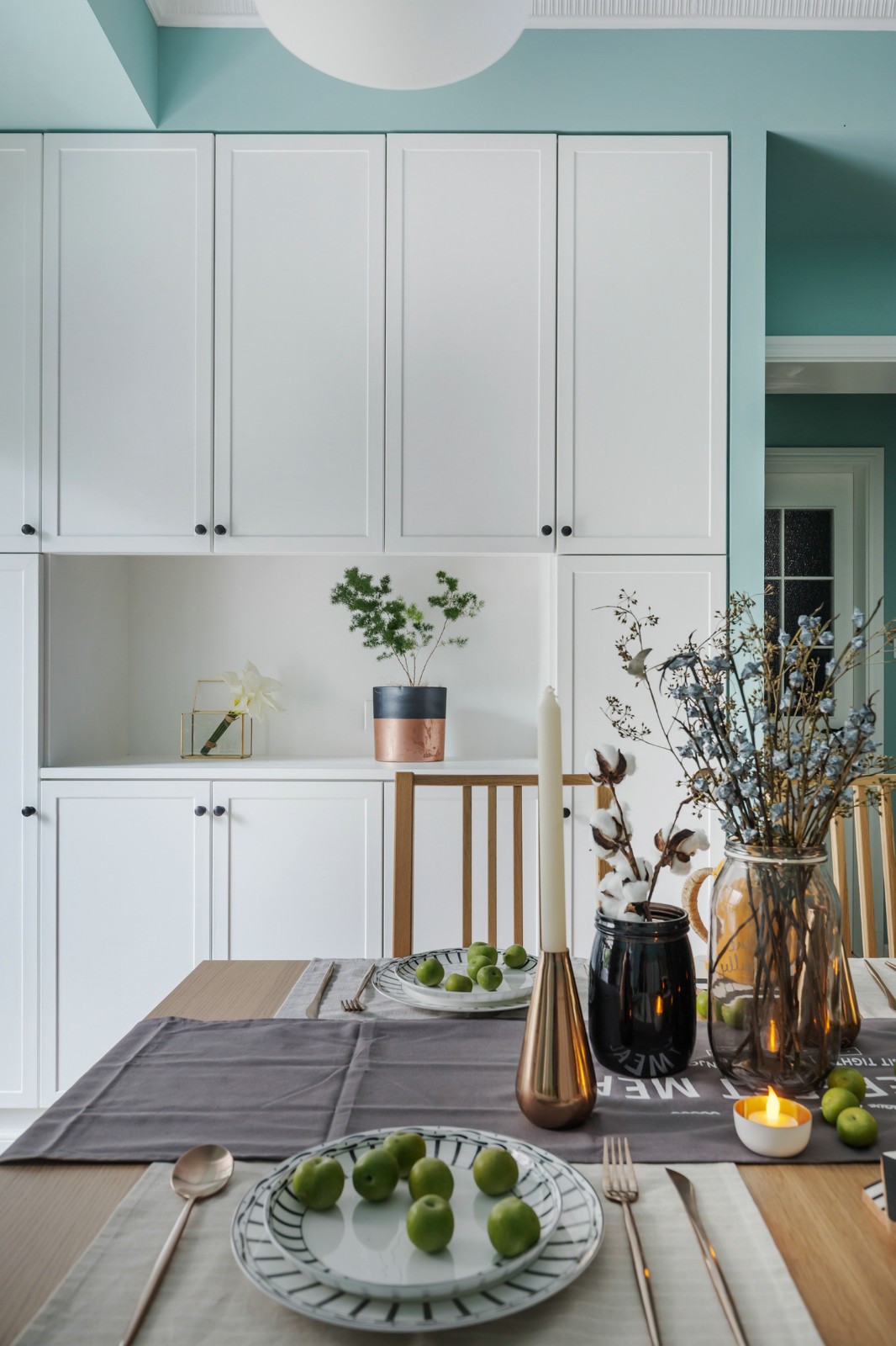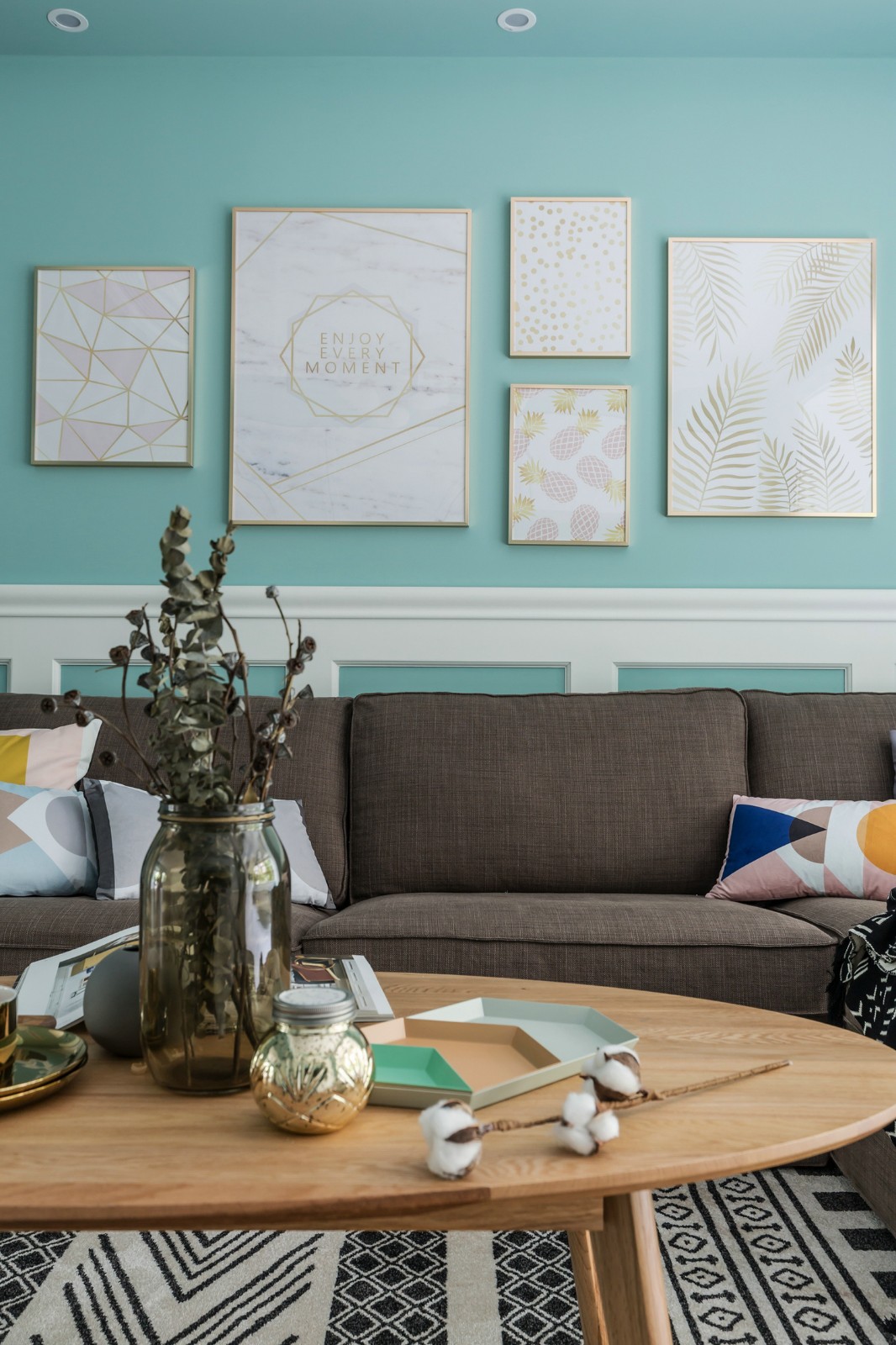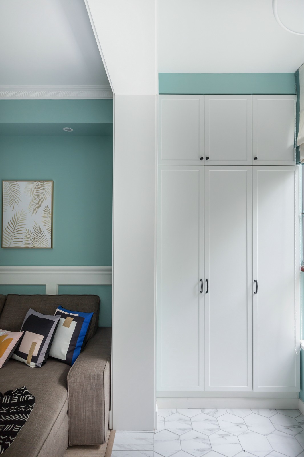整個(gè)三居室的色調(diào)是薄荷綠與白色,剛?cè)霊?,一股清新的氣息就撲面而來。這種薄荷綠很是契合北歐風(fēng)的主題,活潑明亮,清新淡雅??蛷d本身的戶型比較狹長,但是白色與薄荷綠讓客廳的空間看起來十分開闊明顯,隨時(shí)都能給人一種夏天的感覺。