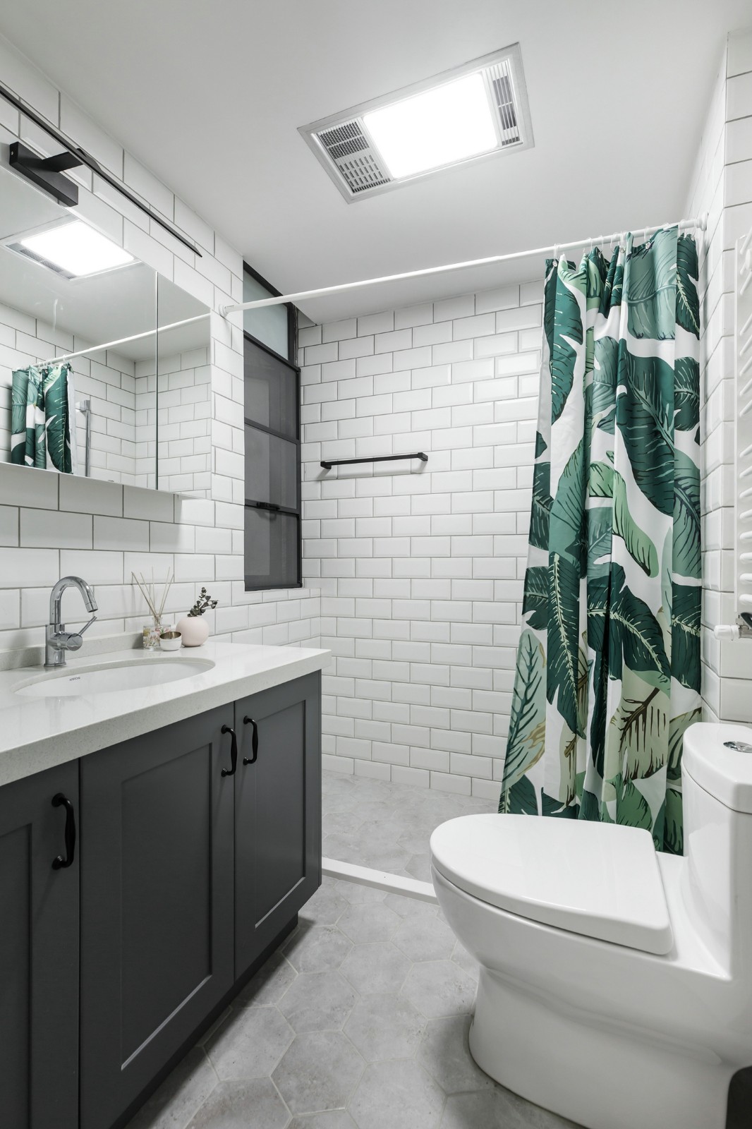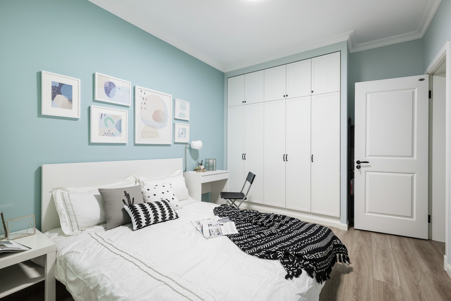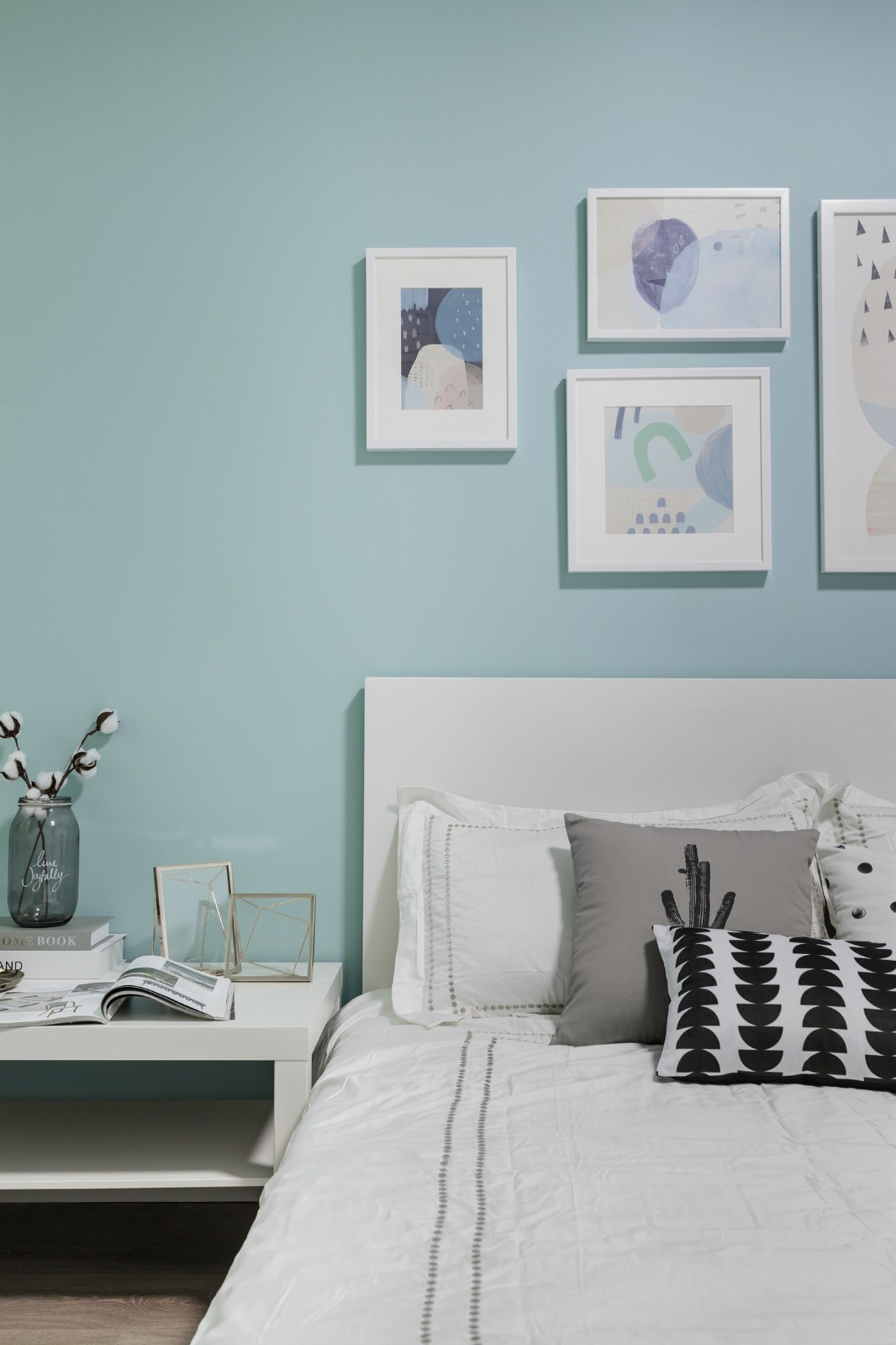整個(gè)三居室的色調(diào)是薄荷綠與白色,剛?cè)霊?,一股清新的氣息就撲面而來。這種薄荷綠很是契合北歐風(fēng)的主題,活潑明亮,清新淡雅??蛷d本身的戶型比較狹長,但是白色與薄荷綠讓客廳的空間看起來十分開闊明顯,隨時(shí)都能給人一種夏天的感覺。