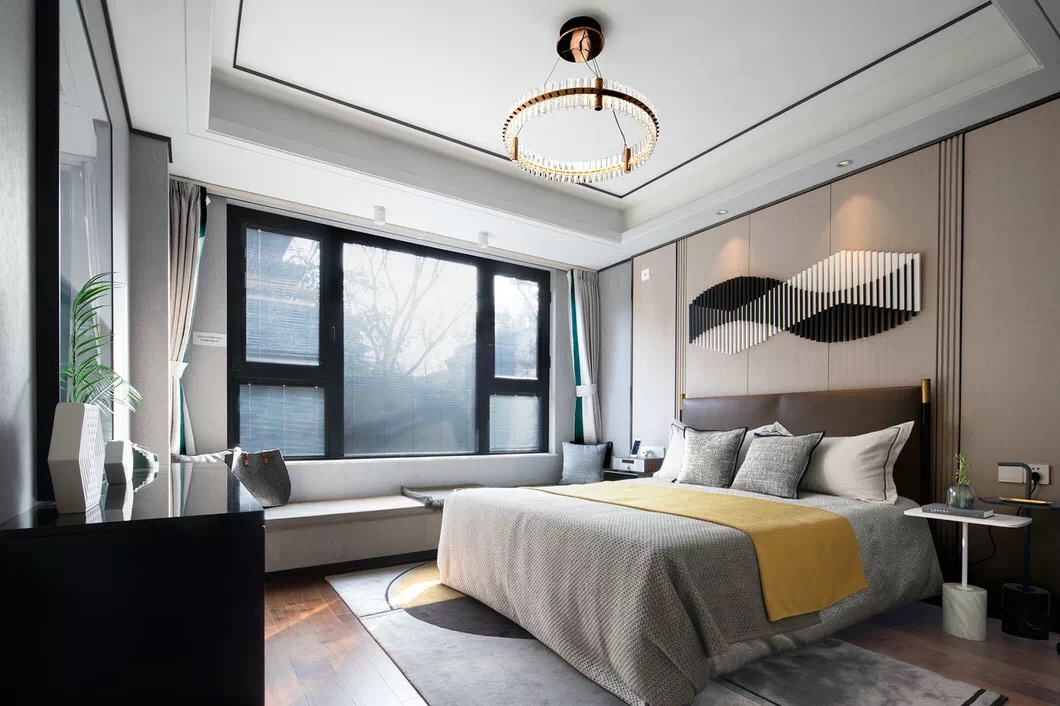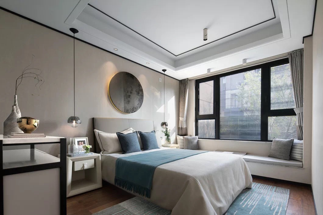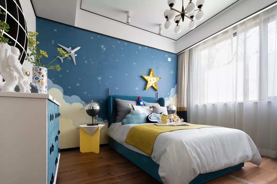 這套中式風(fēng)格沒(méi)有使用過(guò)多的中式元素進(jìn)行裝飾,它更注重打造中式禪意。為了保持家居風(fēng)格的統(tǒng)一性,臥室的裝修方式都是差不多的,但是在兒童房的裝修上,設(shè)計(jì)師以“浩瀚星河”為主題,就像是把星空搬回到了臥室里一樣。