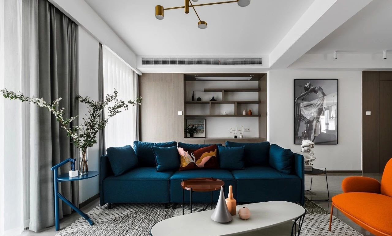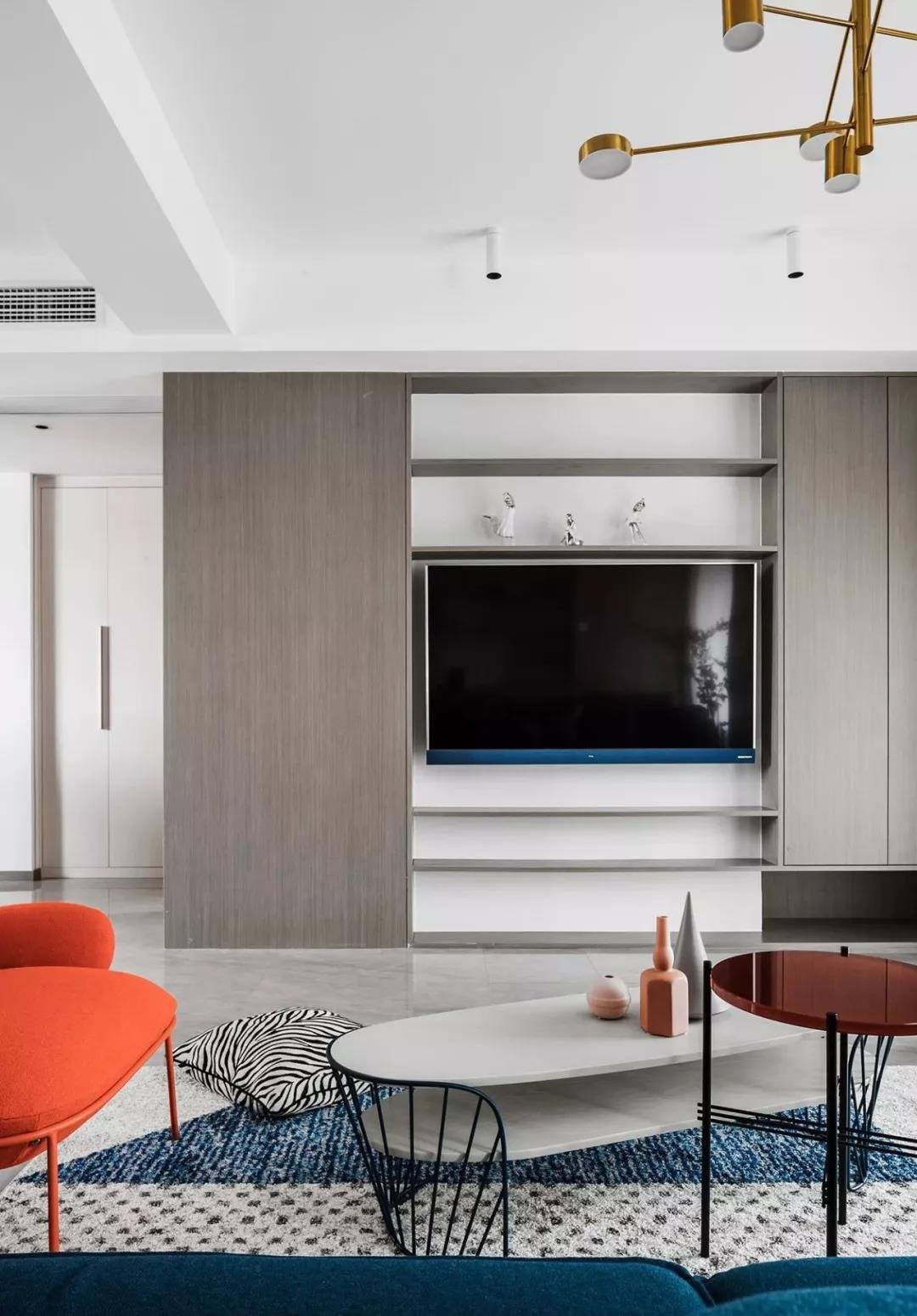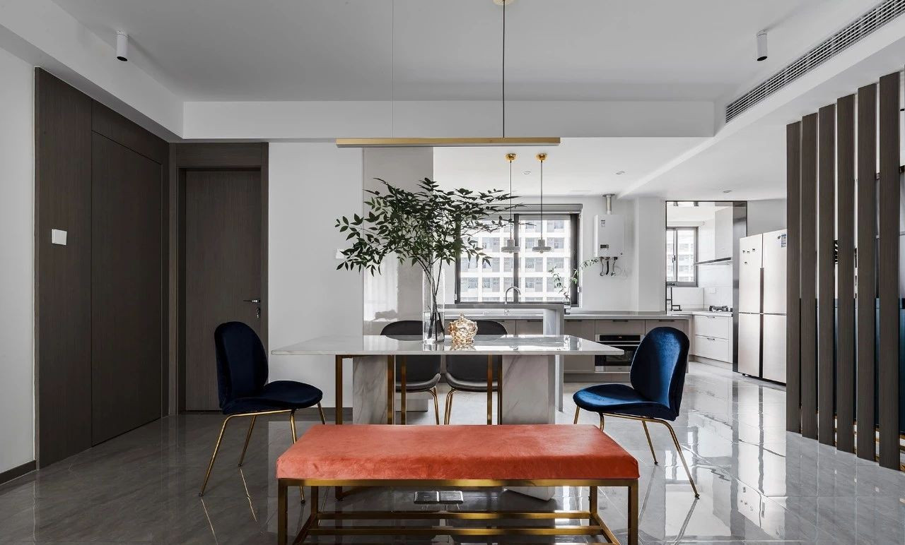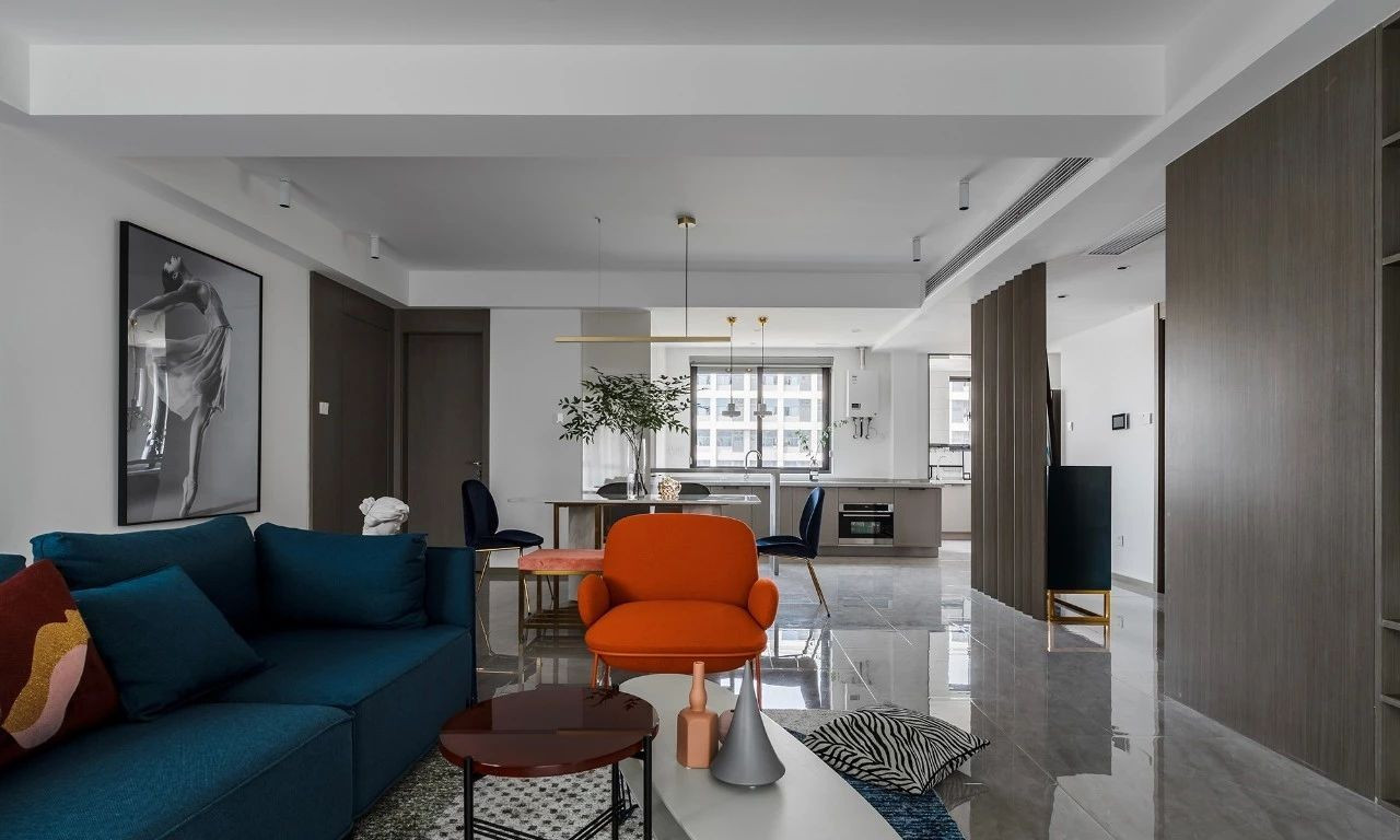 玄關(guān)采用斜面格柵結(jié)合玄關(guān)柜,過道將客餐廳在空間上進行簡潔的軟性分割,撞色的設(shè)計為客廳注入活力,整套房屋的設(shè)計就是兼具優(yōu)雅和理性,活潑的同時又帶著一點克制,很適合年輕的業(yè)主。