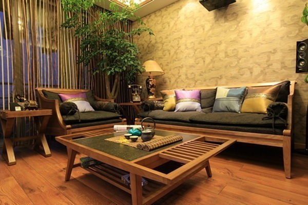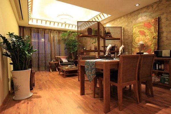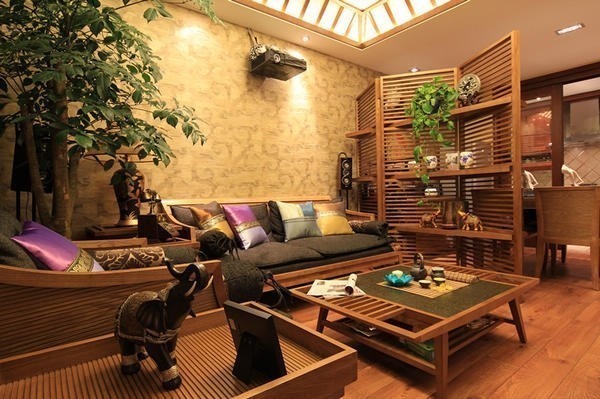 東南亞風(fēng)格的裝飾熱情奔放,而且很注重保留材質(zhì)的本味。客廳的家具都是木材打造,造型簡(jiǎn)單,線條簡(jiǎn)潔,有一種森林樹屋的氣息。客廳和陽(yáng)臺(tái)之間的隔斷,是一片“竹林”,設(shè)計(jì)獨(dú)特,很有東南亞風(fēng)格的特色。