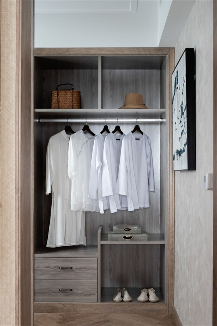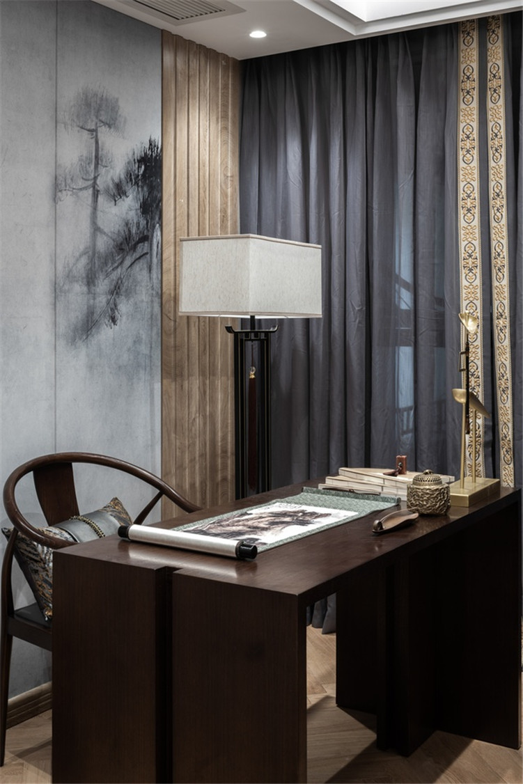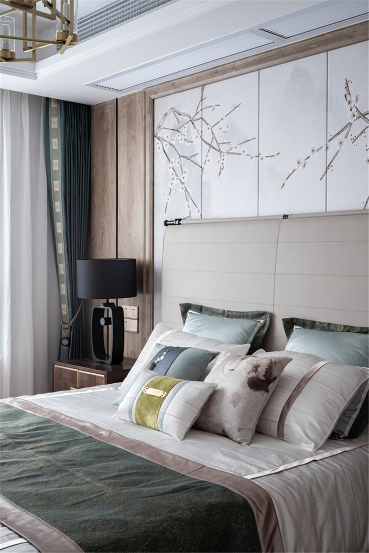 設(shè)計師在臥室背景墻、客廳背景墻和書房背景墻上,下了很多功夫??蛷d的背景墻是一片遠山,意境更深,有一種層次感。書房的背景墻則是柏樹,象征堅強、高尚。而臥室的背景墻則是臘梅,凌寒獨自開,象征君子氣節(jié),業(yè)主很喜歡這些背景墻的立意。
