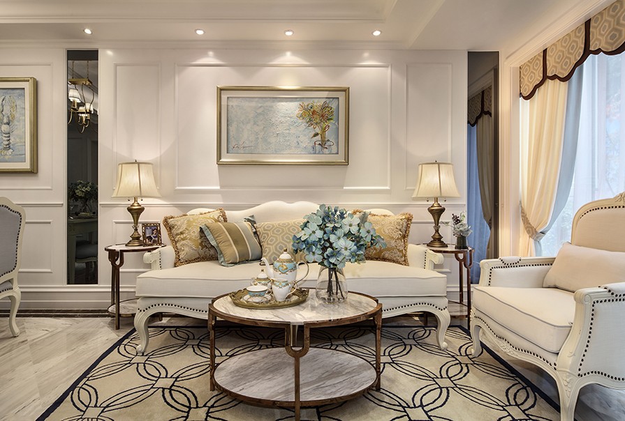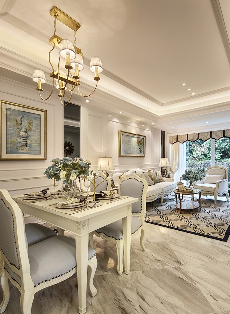 這套歐式風(fēng)格在硬裝上保留歐式神態(tài),軟裝上則放棄了歐式家具的雍容華貴,用淡藍(lán)色布藝配合白色家具輪廓,更符合當(dāng)代人的生活習(xí)慣與品位。設(shè)計師在材料選擇上多用的用純色系,家具的線條十分簡潔,能夠進(jìn)一步提升空間感。