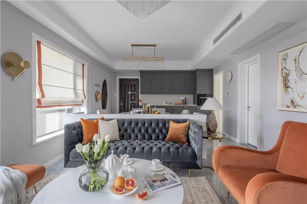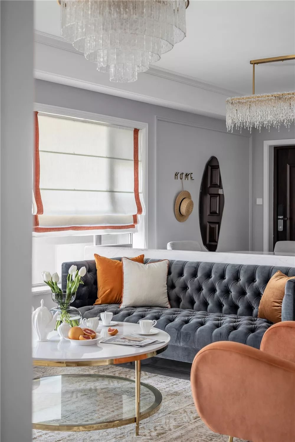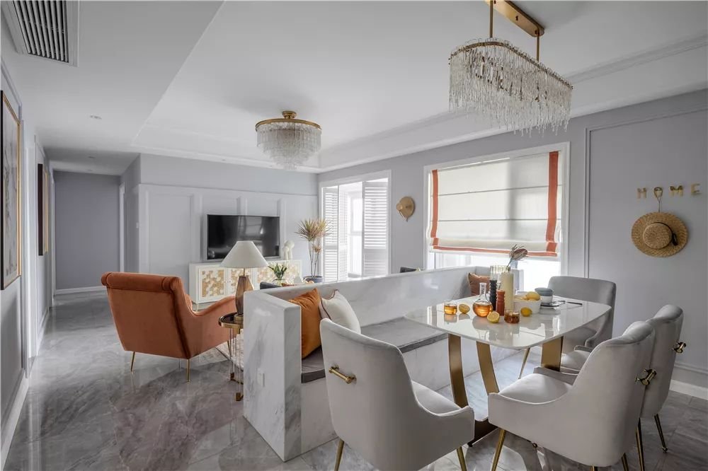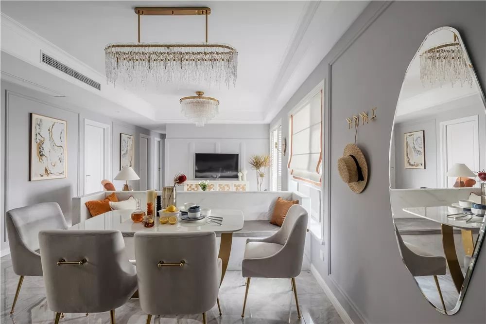 這是一套法式輕奢風(fēng)格的三居室,古典優(yōu)雅,質(zhì)感十足。客廳、餐廳和玄關(guān)同屬一個(gè)空間,所以風(fēng)格設(shè)計(jì)上要保證它的一致性。亮色的單人沙發(fā)和抱枕可以提亮整個(gè)空間,優(yōu)雅又不失活潑。