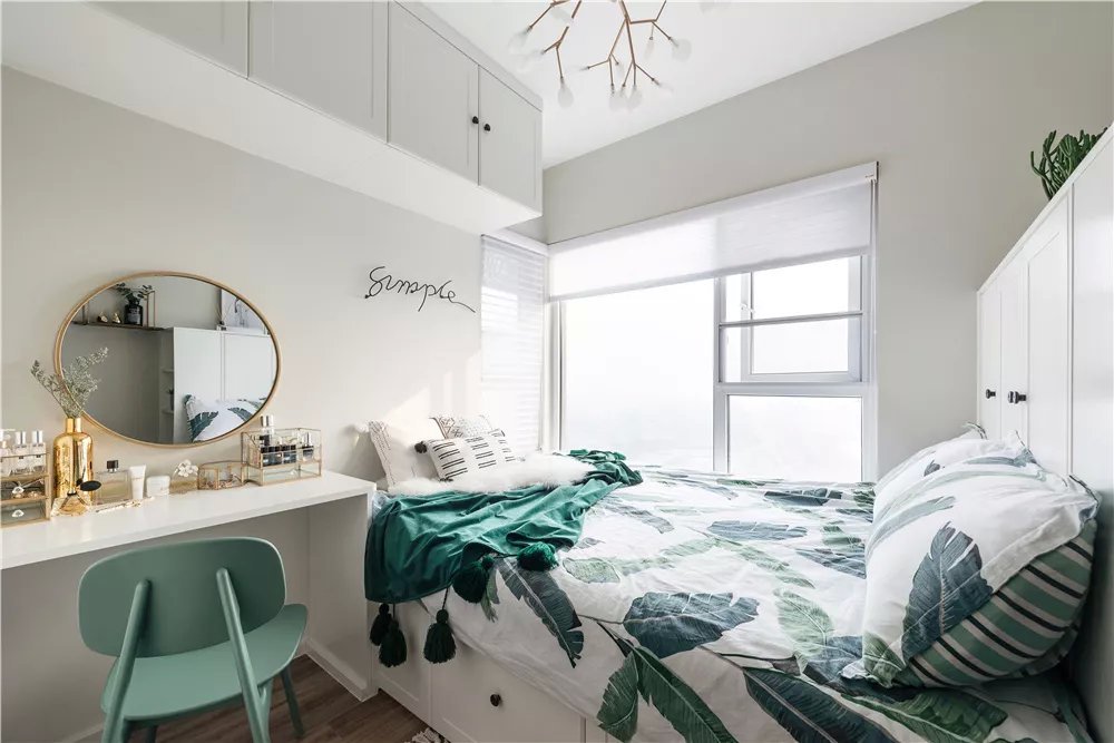 這是一套很經(jīng)典的輕奢北歐風(fēng)設(shè)計(jì),金屬設(shè)計(jì)點(diǎn)綴著整個(gè)空間,提升整體的質(zhì)感。綠色可以打造一種清新自然的感覺(jué),時(shí)尚又大氣。次臥的空間較為緊湊,所以用的是榻榻米加組合柜的設(shè)計(jì),簡(jiǎn)單一面梳妝臺(tái)就能打造一個(gè)實(shí)用性極強(qiáng)的空間。