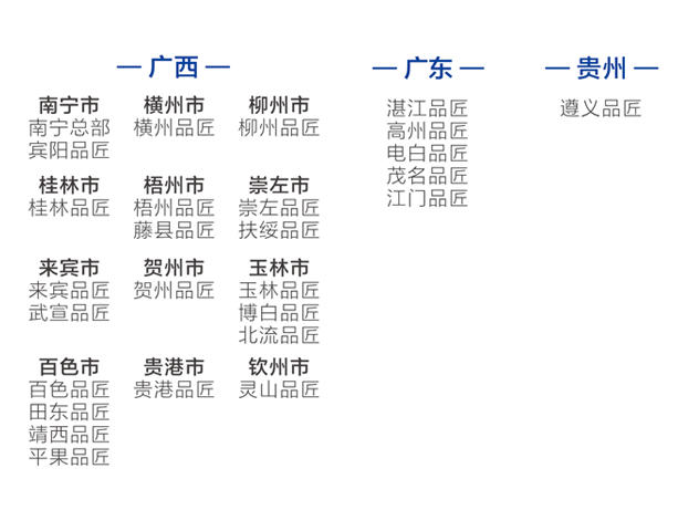 作為從南寧走向全國的桂系裝企品牌,目前已在海口、湛江、柳州、百色等多個城市開設全國直營連鎖分公司,并將以南寧為中心輻射全國設立更多品牌分公司。集團始終秉承“施人品、行匠心、成品匠”的企業(yè)理念,以一站式整裝為優(yōu)勢,以更多、更快、更好、更省的裝修裝飾理念,熱忱服務全國廣大客戶!